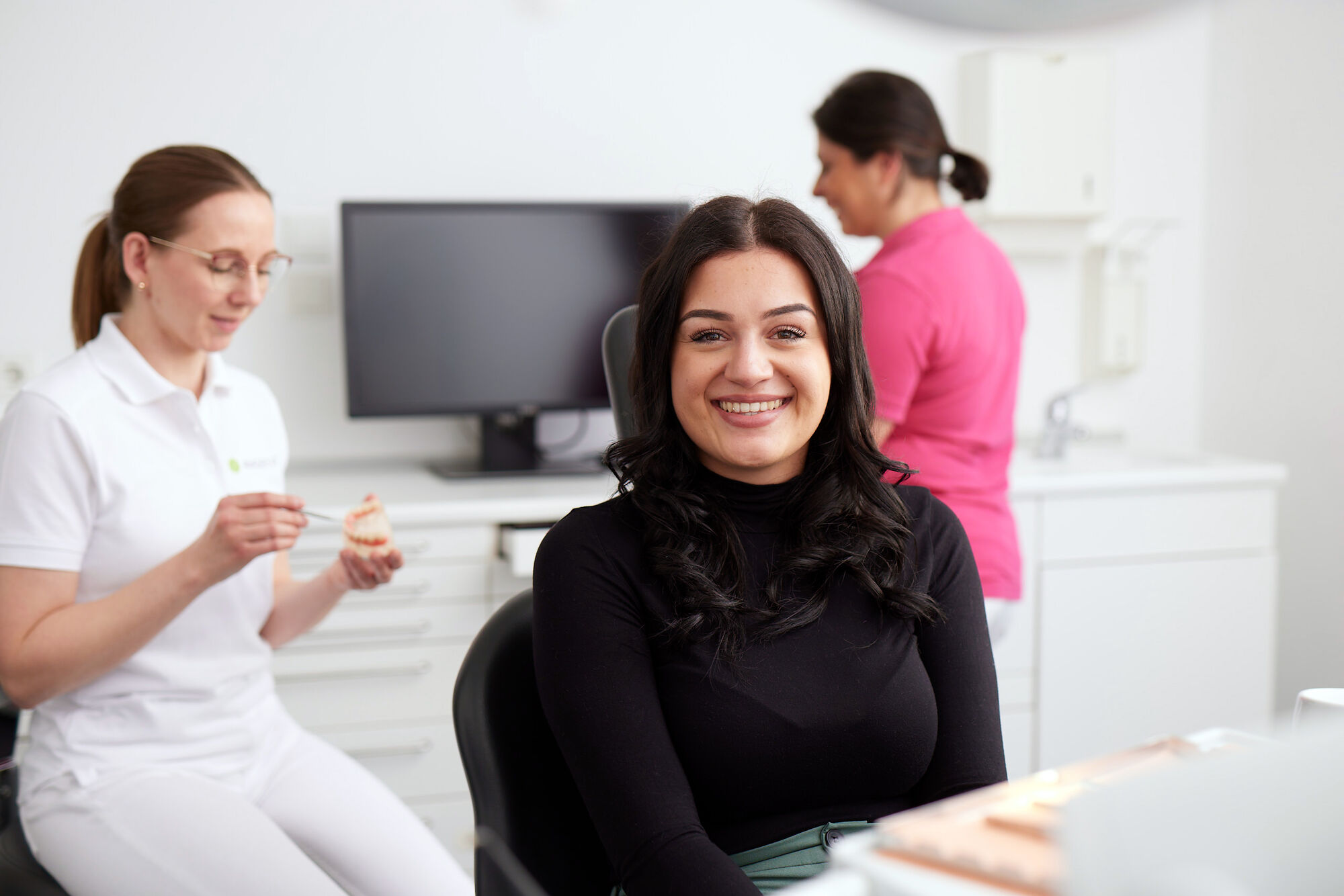 Haben Sie sich für Veneers entschieden, fertigen wir zunächst einen Zahnabdruck an, um Ihre aktuelle Gebisssituation zu dokumentieren. Der Intraoralscanner arbeitet hierbei besonders präzise und zugleich komfortabel. In wenigen Minuten erfasst er ein dreidimensionales, digitales Abbild von Zähnen und Zahnfleisch, ohne die oft unangenehme Prozedur mit Abdruckmasse und -löffel. Die digitalen Bilder sind Grundlage für softwaregestützte Planung und Anfertigung Ihrer Veneers ebenso wie für ein hochwertiges Provisorium. Dieses passen wir Ihnen für die Übergangszeit an, nachdem Ihre Zähne geringfügig beschliffen wurden. Bis zum Ankleben der fertigen Veneers vergehen in der Regel nur wenige Tage.
